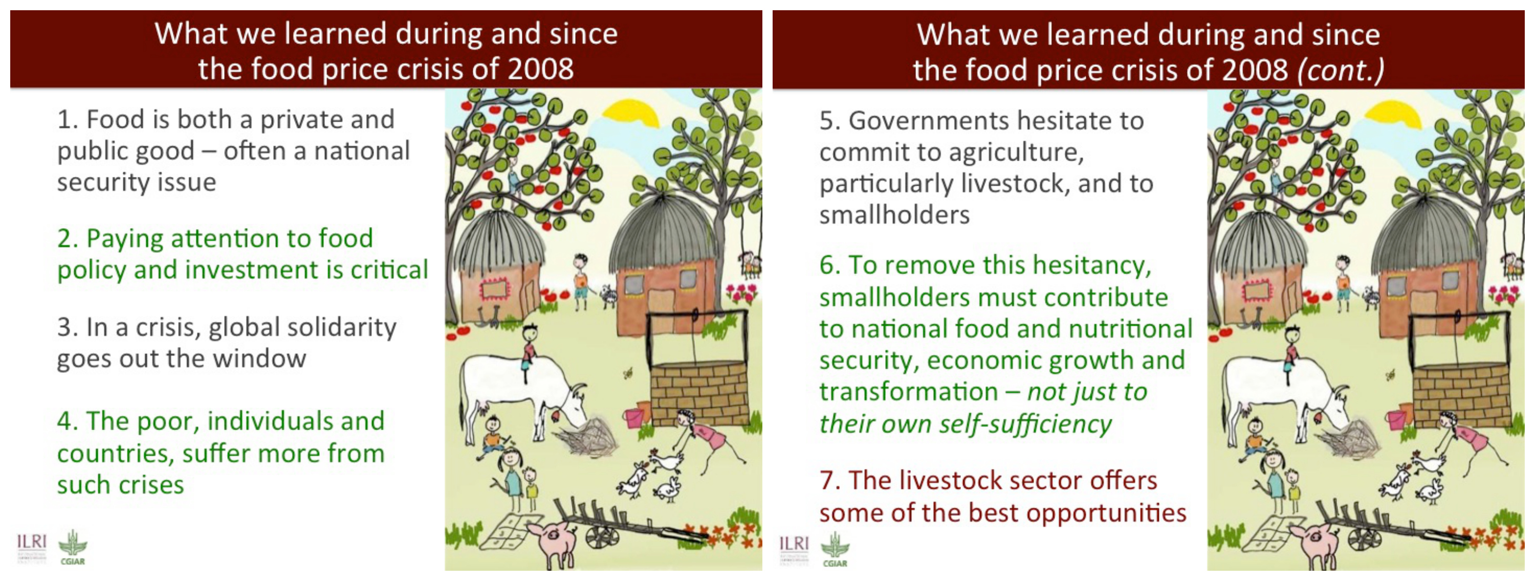 As the world looks towards the future, considers the new sustainable development goals and the prospect of feeding at least 10—maybe more—billion people, it is important that we consider what we have learned from the recent past and how that might inform the coming decades. This presentation considers the lessons of the food price crisis in 2007/08 and translates these, and other trends and policies, into policy-related propositions concerning in particular the livestock sector and its role in food security.