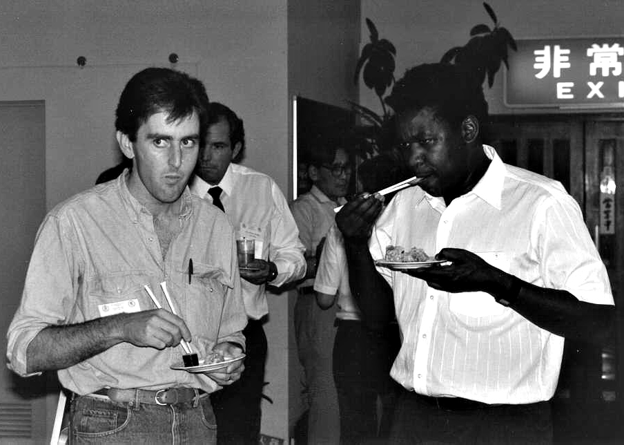 Noel Murphy (left, looking uncharacteristically suspicious), with fellow tryps researcher Phelix Majiwa at some science meeting somewhere in Asia, ‘back in the day’.