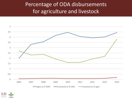 The livestock sector contributes about 40 per cent of agricultural gross domestic product (GDP) in low- and middle-income countries. The figure above shows the percentage of ODA disbursements that agriculture gets—4.5 per cent, and the share that livestock gets of that agricultural ODA—again just 4.5 per cent. So the livestock sub-sector of agriculture gets a minuscule amount of ODA, despite the fact that the livestock sub-sector makes up 40 per cent of agricultural GDP in developing countries.