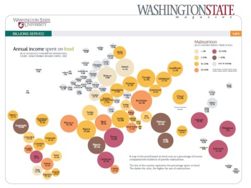 The above graphic from Washington State University makes this point well. The colours of the circle represent the extent of malnutrition: the darker the colour the greater the level of malnutrition. The malnutrition levels are correlated with the percentage of annual income spent on food. We can see in the darker coloured countries a high correlation between people who spend a large proportion of their incomes on food and those that suffer from malnourishment.