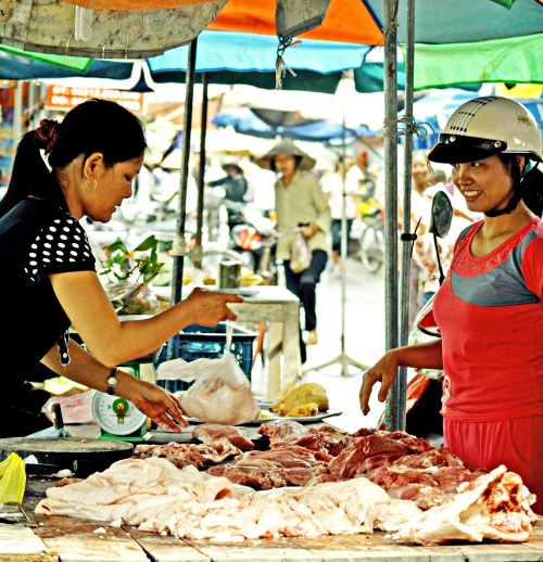 A local pork vendor at the wet market sells her meat to two local women, Hung Yen province, Vietnam (photo credit: ILRI/Nguyen Ngoc Huyen).