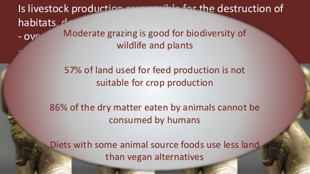 Smith tells his audience that moderate grazing is good for the diversity of both wildlife and plants, that 57% of land used for feed production is unsuitable for crop production, that 86% of the dry matter consumed by animals cannot be consumed b y humans, and that diets with some animal-source foods use less land than vegan alternatives.