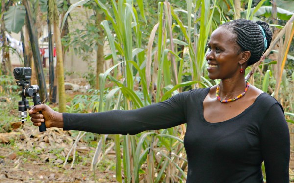 Beatrice Nabitiri, a pig farmer, tries out the 360-degree camera using a gimbal, a pivoted support that allows the camera to rotate about a single axis, at her farm in Masaka, Uganda (photo credit: Manon Koningstein).