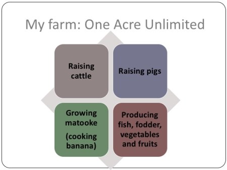 ‘Here’s how it works for me and my family. My farm is called ‘One Acre Limited’. I divided it into quarters. On one quarter, I keep pigs. On another quarter, I keep cattle. On a third quarter, I grow matoke, or cooking banana. And on the other quarter, I grow fish, fodder for the animals and vegetables and fruits.