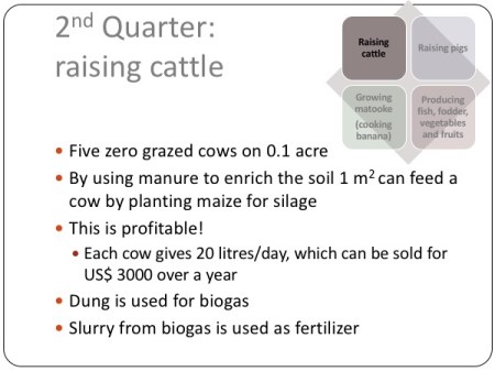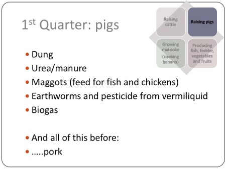 Watch a video about Naluyima’s highly integrated one-acre farm produced by Deutsche Welle: Mama Pig’s Lessons for Ugandan Farmers. ‘Emma Naluyima is a successful farmer in Uganda who has become well known countrywide for her skills in making the most of just a small piece of land. Her farming techniques include planting a type of grass for her animals that grows in just six days. When Naluyima resigned from a well paid job to try her hand at farming, some of her relatives thought she had gone out of her mind. But to their surprise the venture paid off and Naluyima has become a model farmer who is today consulted by both experts and individuals. She runs a variety of projects on the one acre (0.4 hectares) plot of land which she purchased herself. She has a piggery, fish ponds, a banana plantation and vegetable gardens. She also rears poultry, produces biogas and runs a veterinary clinic. . . .’