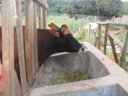 ‘In the second quarter of my one-acre farm, I keep five zero-grazed cattle (my target is 10–15 cows). Each cow gives me on average 20 litres of milk a day. I sell the milk and earn about USD3,000 a year. I use the cow dung to produce biogas and the slurry from the dung to fertilize my maize crop and to make silage. This is very profitable. I don’t have to spend money buying inorganic fertilizer.
