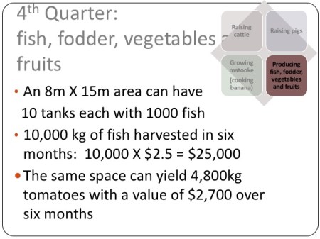 ‘On my fourth quarter of land, I grow fish, fodder, vegetables and fruits. In a space of 8 by 15 metres, I can harvest 10,000 kilograms of fish in six months, generating on average about USD25,000 in six months. And if I’ve not used commercial feed but rather maggots and earthworms from pig manure, I reduce my costs of fish production by three-quarters and get the fish ready for market in 4 rather than 6 months. The same space can yield about 4,800 kilograms of tomatoes over 6 months, for a value of USD2,700.