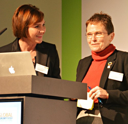 (Left) moderator Nathalie Randin and keynote speaker Shirley Tarawali at an expert panel session of the Global Forum for Food and Agriculture (photo credit: ILRI/Susan MacMillan).