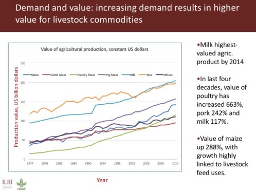 Tarawali gave three examples (again derived from FAOSTAT 2017) of the rising high global value of livestock-derived foods: milk, poultry and maize fodder. As demand increases for these product, their value also increases. As you can see from the figure above, globally, milk has overtaken rice in value.