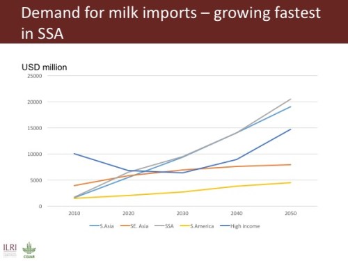 As an example, Tarawali pointed out that Africa’s rising milk imports are the fastest growing in the world. The foreign exchange needed for Africa to import milk, which Africa could produce itself given the appropriate investments, limits the amount of foreign exchange Africa has to import goods it cannot produce itself. (The estimates above, in USD million, should be interpreted as trends rather than actual figures; they were prepared by ILRI’s Dolapo Enahoro using the IMPACT model and are based on a high level of data aggregation.)