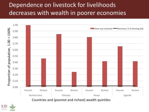And Tarawali countered some old conventional wisdom about livestock being a rich-person’s asset with the above figures, showing that in many of the poorest countries in the world, the people most dependent on farm animals for their livelihoods are poor, and their dependence on livestock reduces as they get richer. (The source for this figure is a paper in review by Dalapo Enahoro, Mats Lannerstad and Catherine Pfeifer: ‘The role of livestock in food and nutrition security: Trends and projections for selected low- and middle-income countries’.) Notice, by way of comparison, that the (black) trend line for the percentage of Germans making up Germany’s labour force is just 1.8%, and that is for all forms of agriculture, including livestock, crop and any other type of agricultural activity (2012 is the latest date for which this figure is available).