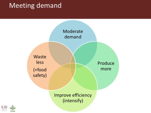 Tarawali outlined four dimensions of the solutions needed to meet the rising global demand for livestock-derived foods in responsible, efficient and sustainable ways: (1) produce more livestock-derived foods, (2) improve the efficiency of livestock production systems to generate production-environmental win-wins, (3) waste less and (4) moderate the demand for these foods. (This figure is partly adapted from a paper by Elin Röös, Bojana Bajželj, Pete Smith, Mikaela Patel, David Little and Tara Garnett—Greedy or needy? Land use and climate impacts of food in 2050 under different livestock futures—published by Global Environmental Change in 2017.)