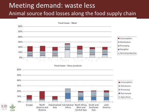 As Tarawali shows in the FAO figure above, there are big opportunities to reduce waste of meat and dairy but these occur in very different places along the livestock value chains in different parts of the world (FAO: Global food losses and food waste—Extent, causes and prevention, 2011).