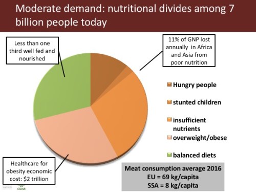 And regarding moderating demand for milk, meat and eggs, Tarawali reminded her audience of the vast nutritional divides that remain in the world today, with less than one-third of the world’s population well fed and nourished and another third suffering from hunger, insufficient nutrients and stunting. The addition of very modest amounts of livestock-derived foods in the first 1,000 days of life is particularly critical for preventing physical and cognitive impairments in child development. Indeed, it is now argued that no infant can be adequately nourished without the addition of some livestock-derived foods, which are rich not only in proteins but also in essential micronutrients and are delivered in forms highly ‘bioavailable’ to humans.