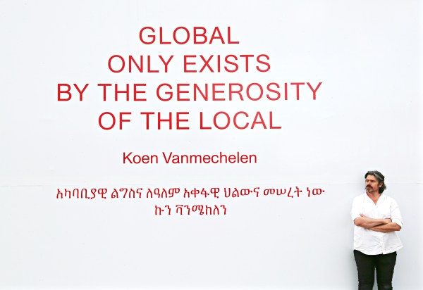 Belgian artist Koen Vanmechelen stands before the quote and signage he developed