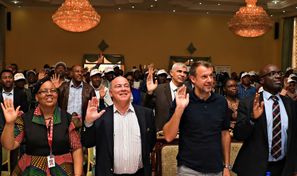 Siboniso (‘Boni’) Moyo (front, left), the ILRI director general’s representative in Ethiopia, pledges with many others to work together toward Zero Hunger in Ethiopia in a celebration on World Food Day, 16 Oct 2018, held in Mojo, central Ethiopia (photo credit: ILRI/Apollo Habtamu).