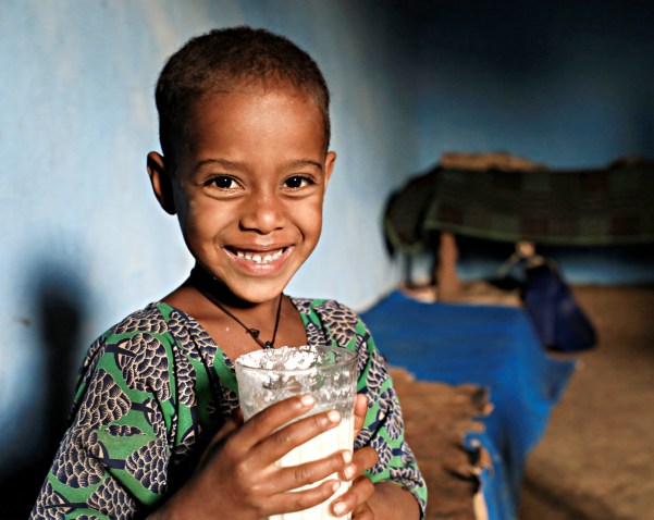 Ethiopian girl drinking milk produced by the family cow (photo credit: Africa Rising).