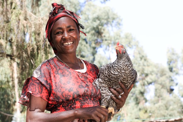 Ethiopian woman holding one of her chickens (photo credit: ILRI/Apollo Habtamu).