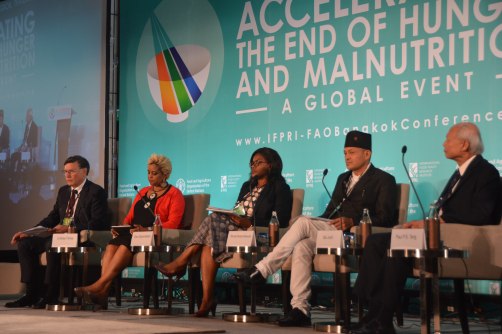 Lindsay Falvey (left) chairs a session at the IFPRI-FAO global conference on Accelerating the End of Hunger and Malnutrition, held in Bangkok in 2018 (photo credit: ILRI/Susan MacMillan).