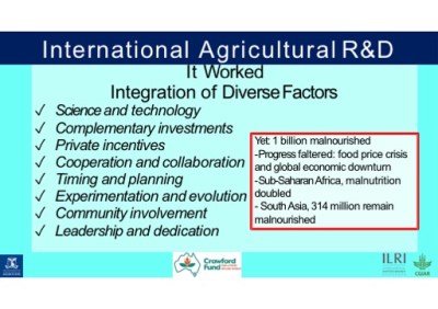 He said that diverse factors helped make this agricultural research for development work so well, but that one billion people remained malnourished.