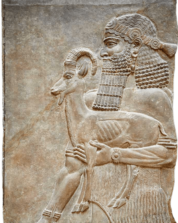 Stone relief of a man holding an ibex, 713–706 BC, from Dur Sharrukin, the Palace of Assyrian King Sargon II, at Khorsabad, in present-day northern Iraq (photo credit: Louvre Museum).